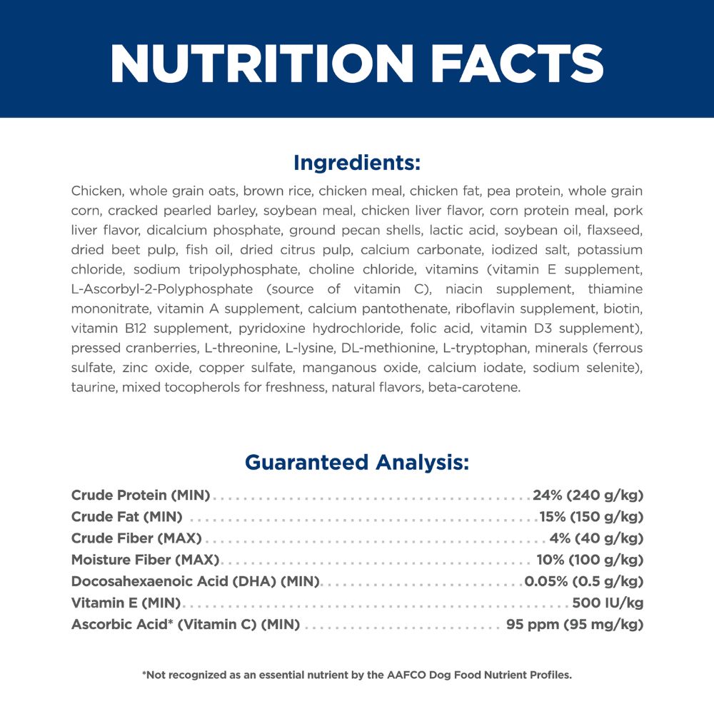 Chicken Meal, Whole Grain Wheat, Whole Grain Sorghum, Chicken Fat, Whole Grain Corn, Corn Gluten Meal, Cracked Pearled Barley, Brown Rice, Chicken Liver Flavor, Dried Beet Pulp, Pork Flavor, Flaxseed, Fish Oil, Dicalcium Phosphate, Lactic Acid, Soybean Oil, Potassium Chloride, Iodized Salt, L-Lysine, vitamins (Vitamin E Supplement, L-Ascorbyl-2-Polyphosphate (source of Vitamin C), Niacin Supplement, Thiamine Mononitrate, Vitamin A Supplement, Calcium Pantothenate, Riboflavin Supplement, Vitamin B12 Supplement, Pyridoxine Hydrochloride, Biotin, Folic Acid, Vitamin D3 Supplement), Choline Chloride, L-Threonine, minerals (Ferrous Sulfate, Zinc Oxide, Copper Sulfate, Manganous Oxide, Calcium Iodate, Sodium Selenite), Calcium Carbonate, Taurine, Mixed Tocopherols for freshness, Natural Flavors, Green Peas, Apples, Cranberries, Carrots, Beta-Carotene, Broccoli.